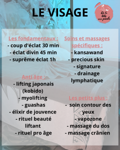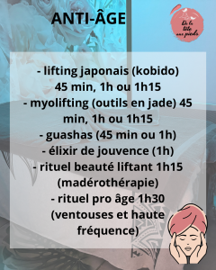 - Lifting japonais (kobido) / Jpanese facelift (kobido) : 45min, 1h, 1h15