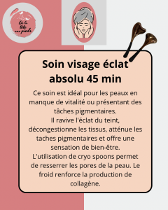 This treatment is ideal for skin lacking vitality or with pigmentation spots. It revives the radiance of the complexion, decongests the tissues, reduces pigment spots and offers a feeling of well-being. Using cryo spoons helps tighten the pores of the skin. Cold strengthens collagen production.