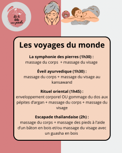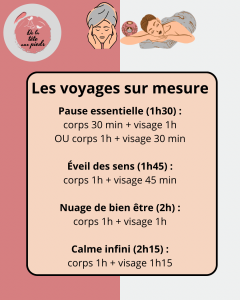 Voyages / Traveling De la tête aux pieds a créé pour vous de jolis voyages pour prolonger le plaisir à prix doux!De la tête aux pieds has created for you beautiful trips to extend the pleasure at low prices!Durée1h301h452h2h15Prix115130€145€160€